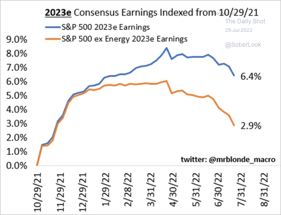 14. Earnings beats. Only 68% of S&P 500 companies that have reported have topped earnings estimates. That’s the lowest since Q1 2020 (63%).