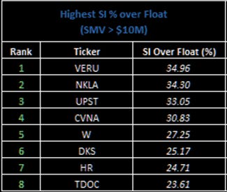 20. Biggest shorts. These are the most shorted stocks by % over float.