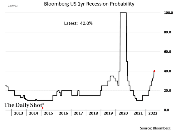 1. Recession meter. The probability of a recession—according to Bloomberg—is around 40% and rising.