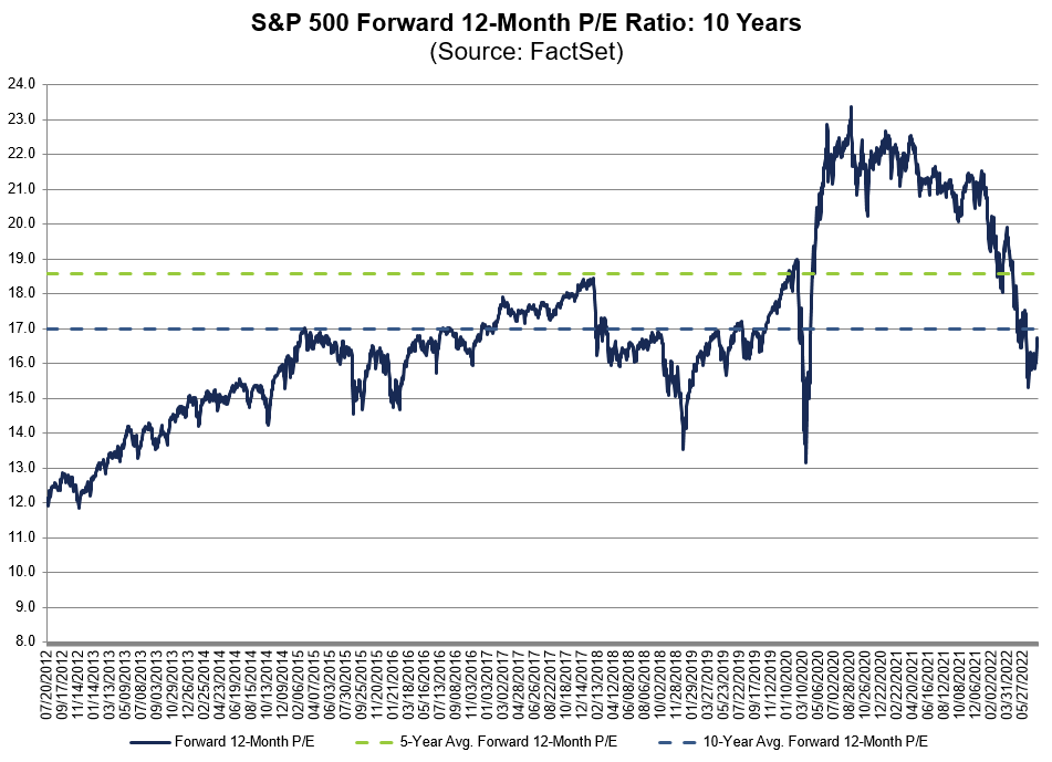 23. Multiples outlook. The 5-year fwd P/E average is 18.6. The 10-year fwd P/E average is 17.0. The current fwd P/E ratio for the S&P is below both at 16.7.