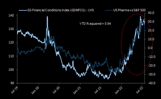 22. Pharma safety from harsh financial conditions. The tighter financial conditions get, the better pharma performs relative to the S&P 500.