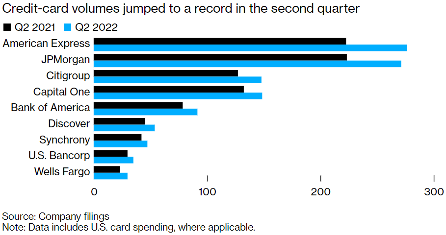 4. Spending surge. Consumers are still spending: overall credit card volume jumped 20% in Q2. They’re shifting to lower-cost products, however.