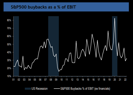 22. Buybacks. As they relate to profits, stock repurchases remain low.