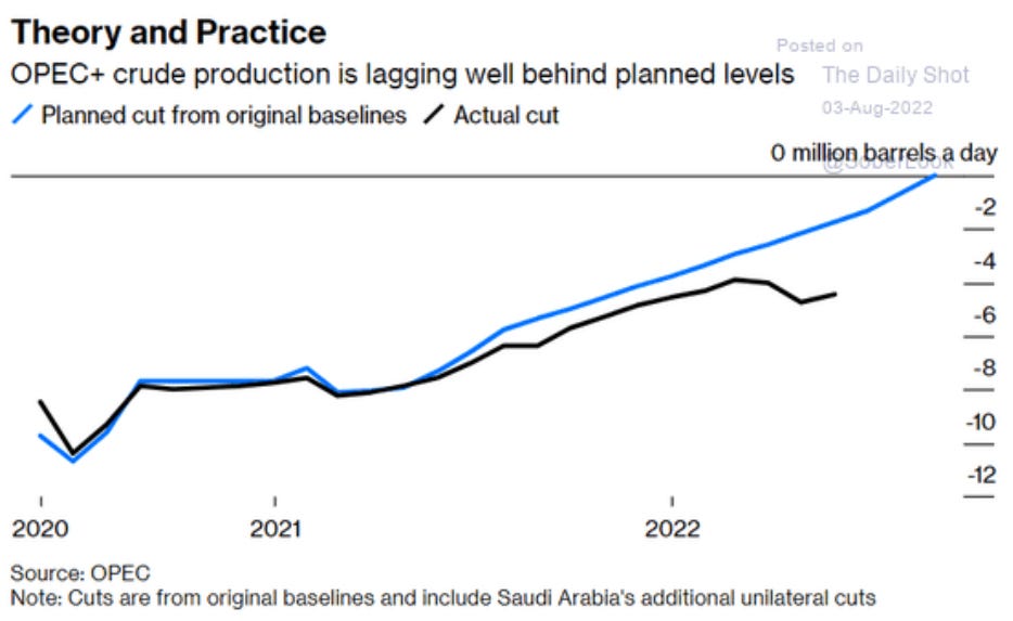 4. Biden strikes out. The Oil Cartel (OPEC+) has already consistently failed to follow through on promised output levels. Today it proposed an increase of 100,000 barrels per day in September…this is the second smallest increase in history.