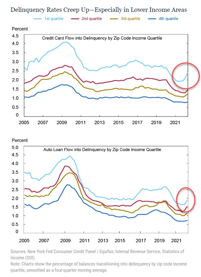 5. Delinquencies up. We’re seeing an uptick in credit card and auto delinquencies.