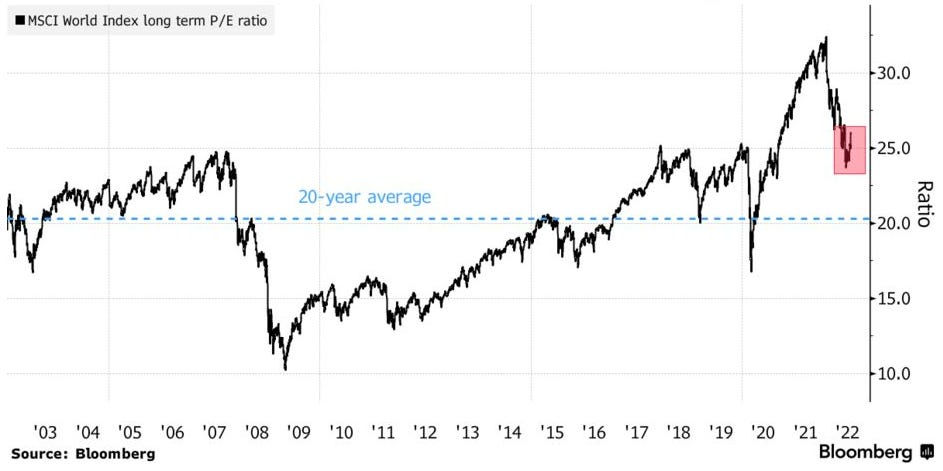 30. Global P/E. And finally, yesterday we noted that the S&P 500 was “near its average year-end P/E ratio (since 1989) of 19.6”. Valuations don’t look so attractive when considering global stocks, where the P/E ratio remains well above the 20-year average.