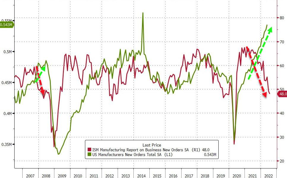 16. Orders divergence. “And notably, this factory orders increase comes as ISM's survey show manufacturing orders tumbling? Perhaps the survey is 'real' (inflation adjusted) and the hard data is nominal? Or the survey is just a sign of ugly things to come (like in 2007).”