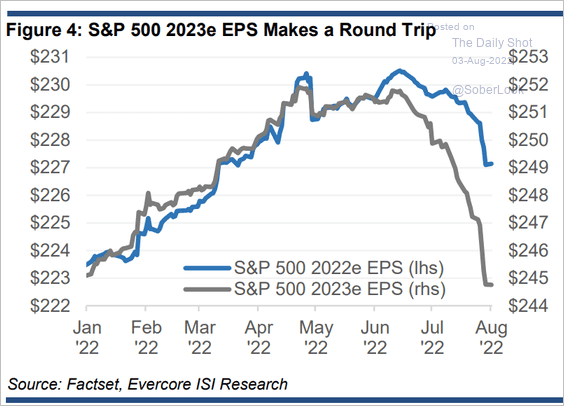 23. S&P earnings. “With 67% of S&P 500 companies having reported, 69% are beating 2Q earnings (vs. 79% avg. last 4Qs) and 65% are beating revenue estimates (vs. 77%)” - JPM