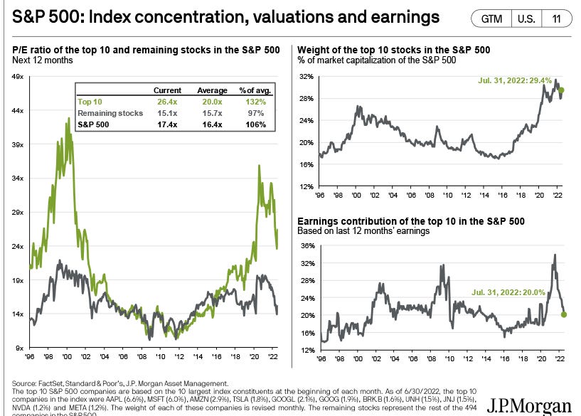 24. Lion’s share. The top 10 stocks in the S&P 500 used to account for ~34%. of the index’s earnings. That’s down to 20%. They still command nearly 30% of the market cap.