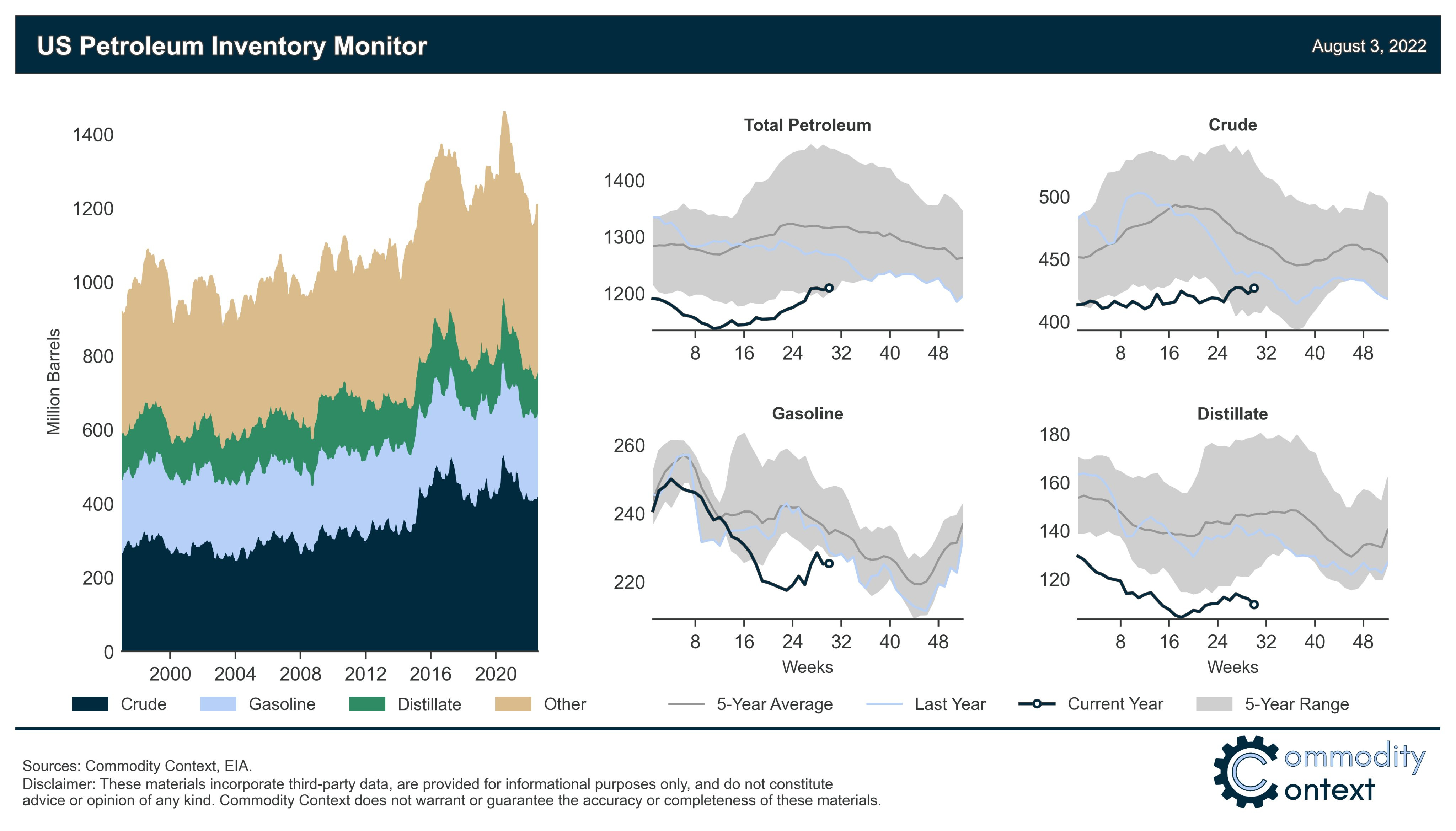 3. US inventories. Total US petroleum inventories rose by ~3.5 million barrels last week but remain within the lower bounds of their 5-year ranges, or below them outright.