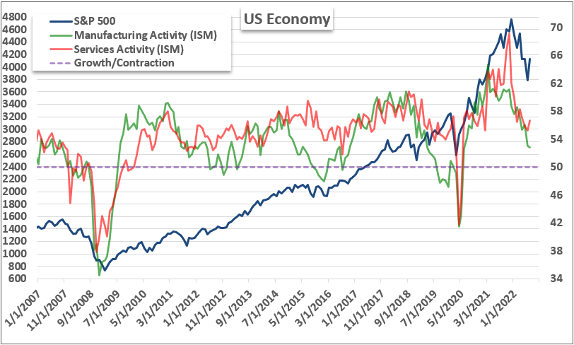 13. ISM & S&P 500. Here’s the S&P’s price overlaid with ISM Manufacturing and Services Activity.