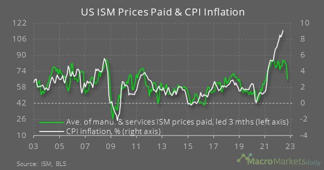 12. ISM Prices Paid & Inflation. The drop in ISM prices paid (an average of manufacturing and services) has yet to be reflected in headline inflation.