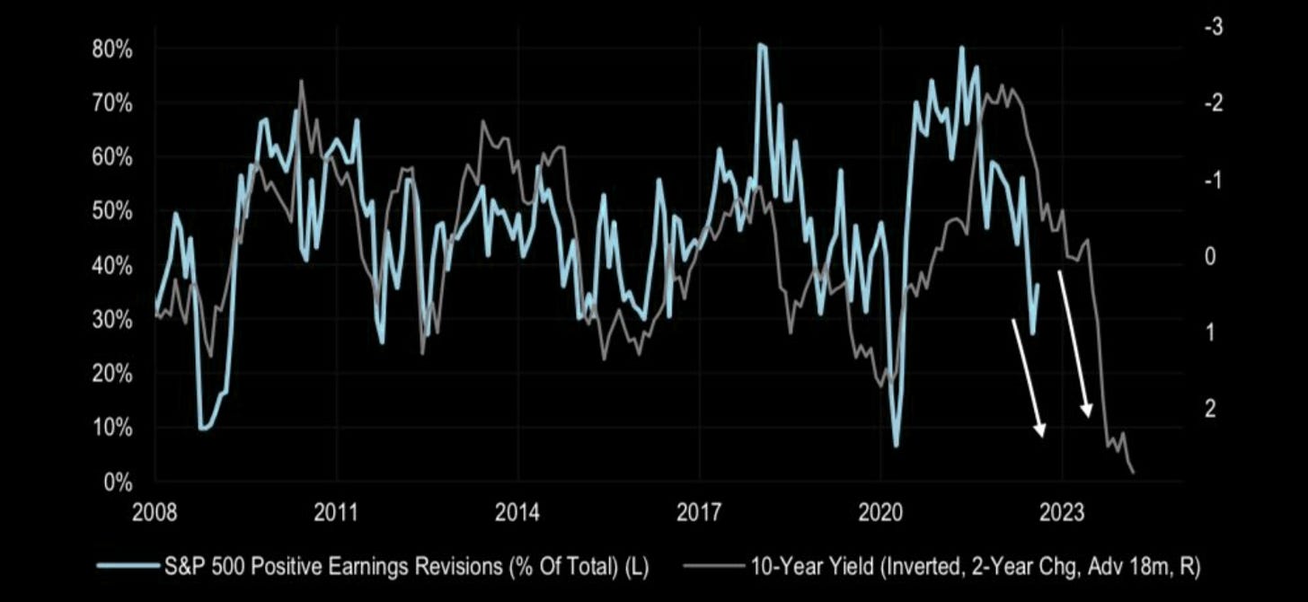 29. Rates & earnings. And finally, from Kantro: "The longer rates stay high, the longer we’ll see downside momentum to earnings revisions. If earnings estimates for 2023 ($244) don’t change, there is only a 2% gain into year end from EPS from current NTM estimates. Anything beyond that must come from P/E expansion".