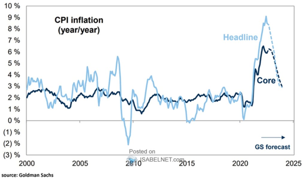 13. Inflation forecast. Goldman has core inflation ending "2022 at 6.1% and 2023 at 2.9%"