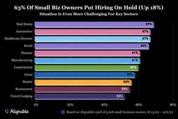 10. Small biz (I). "63% of small businesses have paused hiring, largely in real estate, autos, healthcare, retail, finance, and manufacturing".