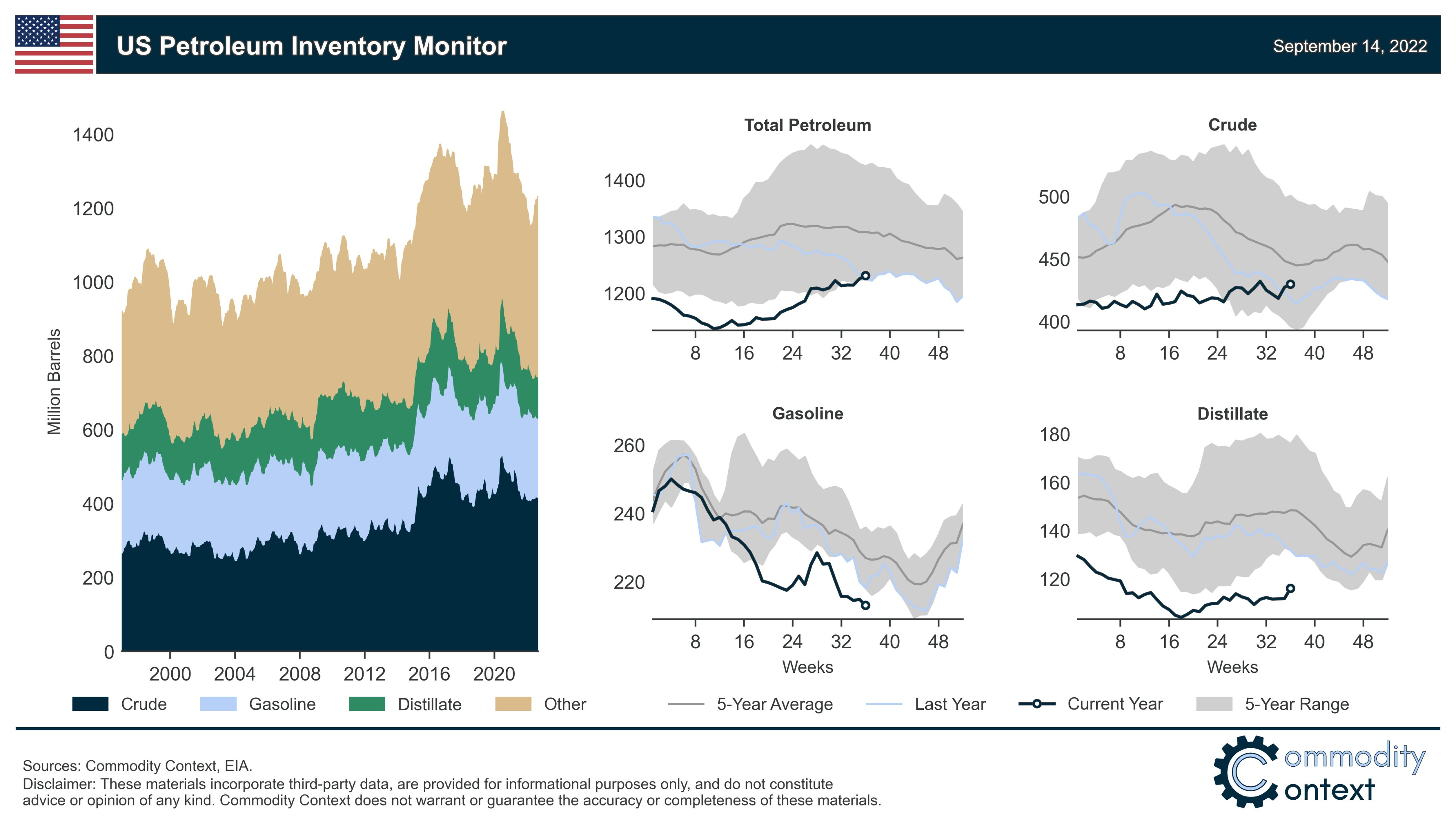 3. US petroleum inventory levels. Stocks for total petroleum, crude, gasoline, and distillate for the week ending September 9.
