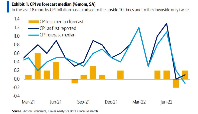 12. CPI surprise. "In the last 18 months CPI inflation has surprised to the upside 10 times and to the downside only twice".