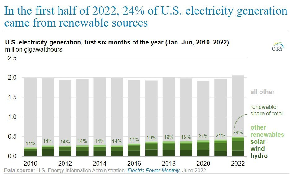 1. Record renewables. A record 24% of US power generation came from renewables in the first half of 2022.