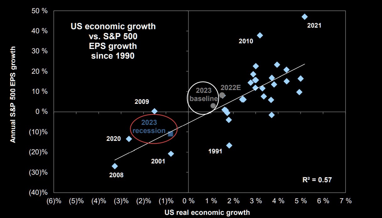 9. EPS vs. economic growth. Again, from Goldman: “If a recession unfolds in 2023, S&P 500 EPS would fall by 11% (vs. growth of 3%).