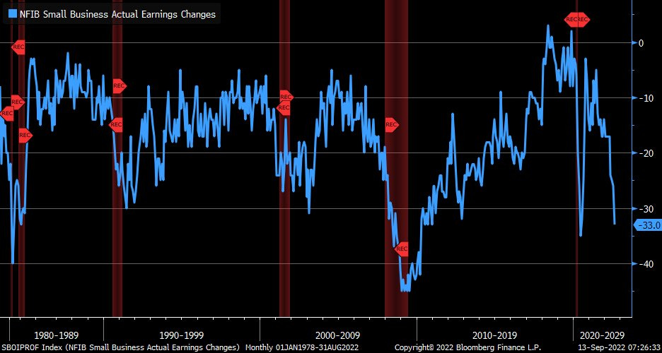 11. Small biz (II). The "percentage of small businesses with positive earnings trends continues to plunge and is firmly recessionary".