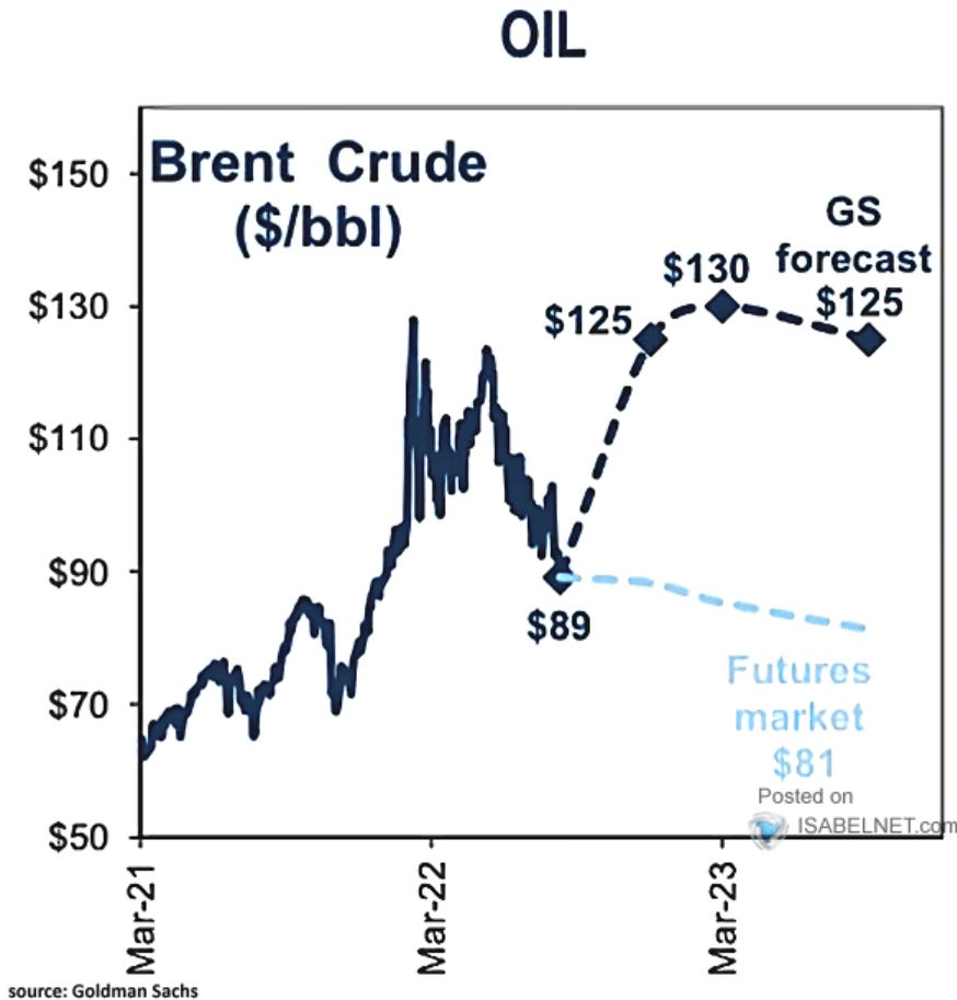 4. Oil price forecast. Goldman Sachs sees prices for Brent reaching $130 a barrel in 2023.