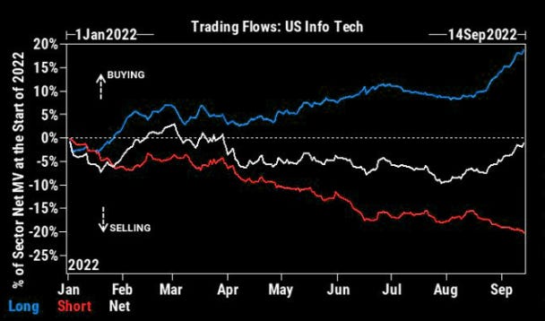 26. Short covering Info Tech. Hedge funds have been covering short positions against Information Technology. According to Goldman, they have been net buyers in 12 out of the last 14 days.